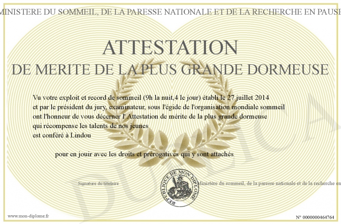 Envoyez par email votre Attestation de mérite de la plus grande dormeuse personalisé