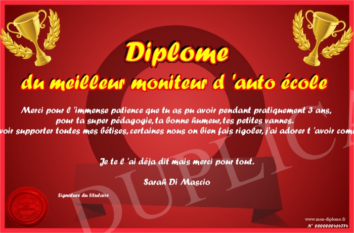Envoyez par email votre Diplôme du meilleur moniteur d 'auto école personalisé