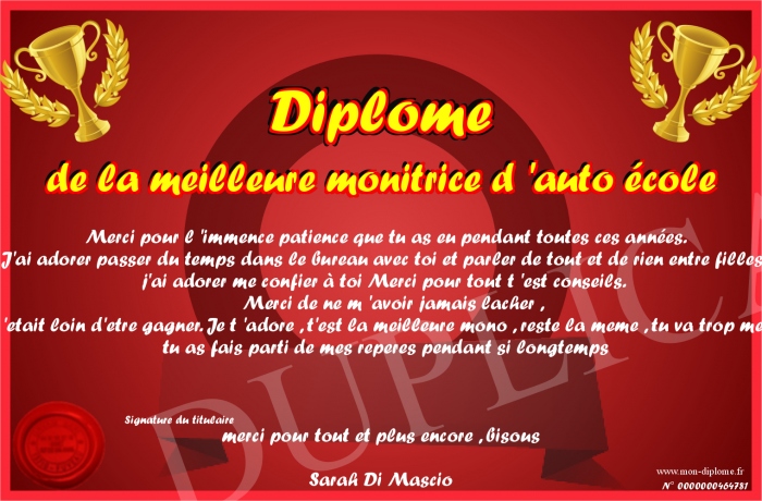 Envoyez par email votre Diplôme de la meilleure monitrice d 'auto école personalisé