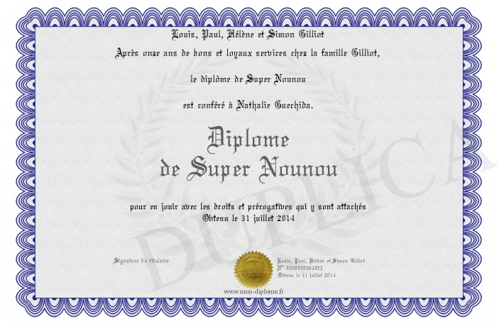 Envoyez par email votre Diplôme de Super Nounou personalisé