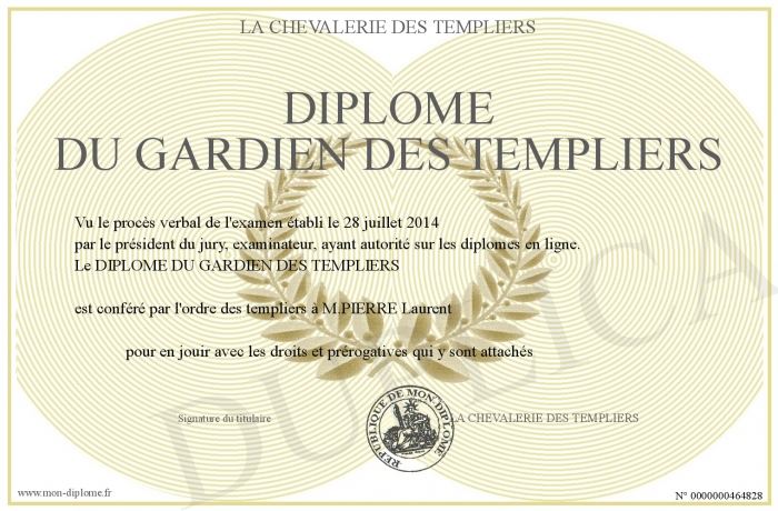 Envoyez par email votre Diplôme du GARDIEN DES TEMPLIERS personalisé
