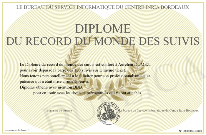 Envoyez par email votre Diplôme du record du monde des suivis personalisé