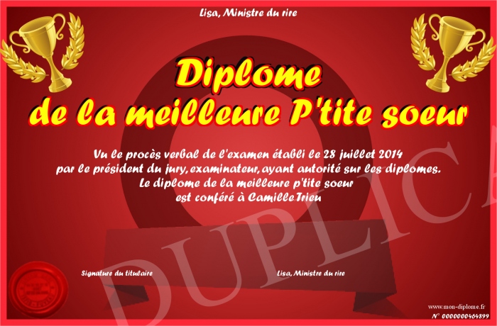 Envoyez par email votre Diplome de la meilleure P'tite soeur personalisé