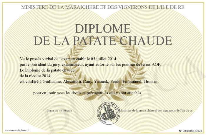 Envoyez par email votre Diplôme de la patate chaude personalisé