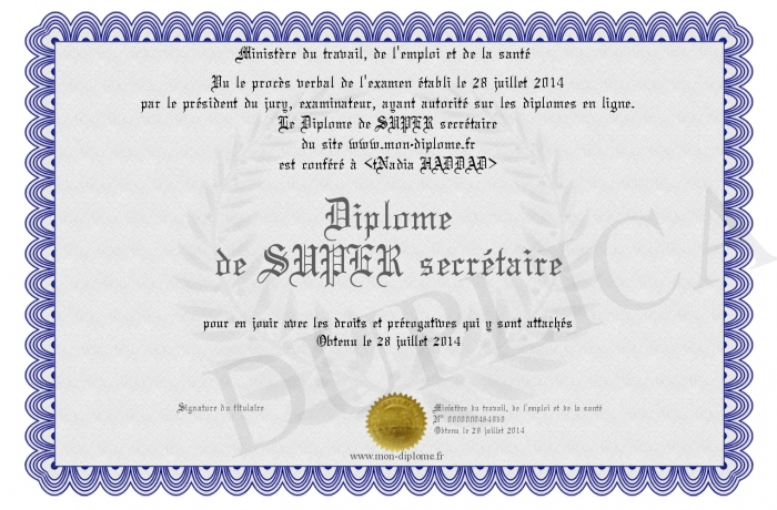 Envoyez par email votre Diplome de SUPER secrétaire personalisé