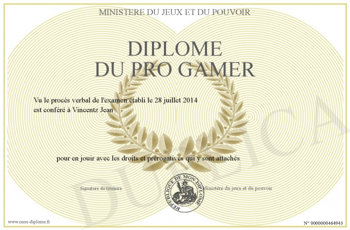 Envoyez par email votre Diplôme du PRO GAMER personalisé
