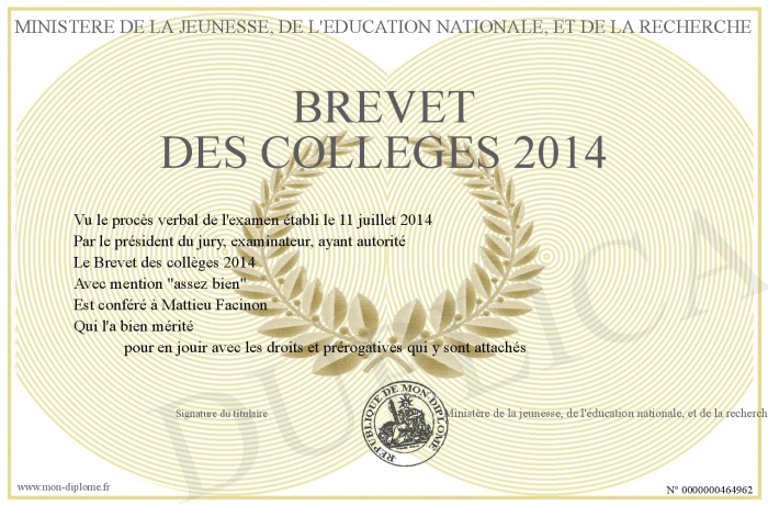 Envoyez par email votre Brevet des collèges 2014 personalisé