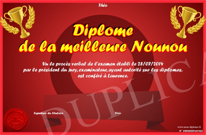 Envoyez par email votre Diplome de la meilleure Nounou personalisé