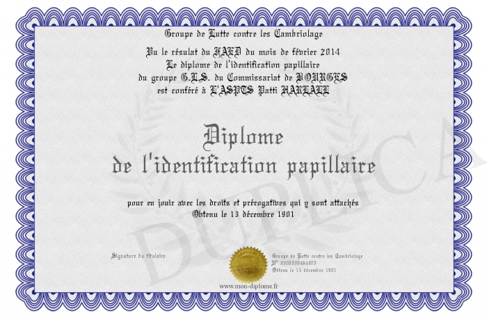 Envoyez par email votre Diplôme de l'identification papillaire personalisé