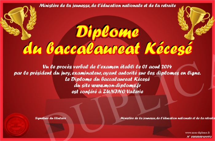 Envoyez par email votre Diplôme du baccalaureat Kécesé personalisé