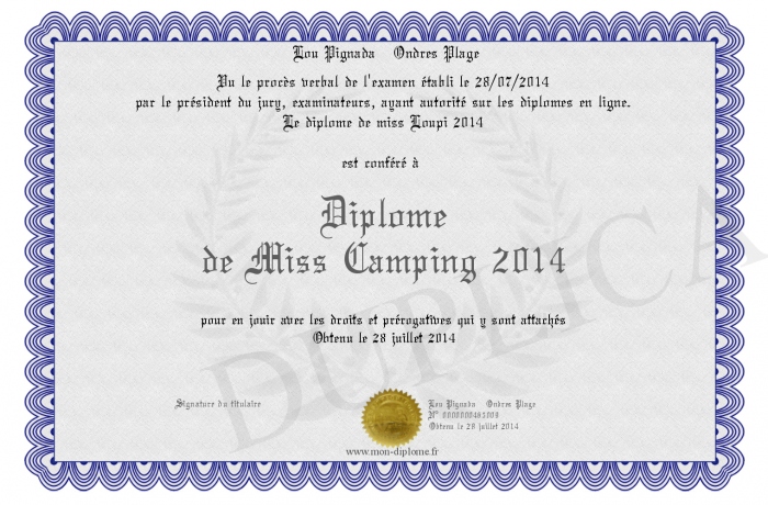 Envoyez par email votre Diplôme de Miss Camping 2014 personalisé