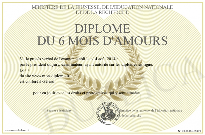 Envoyez par email votre Diplôme du 6 mois d'amours personalisé