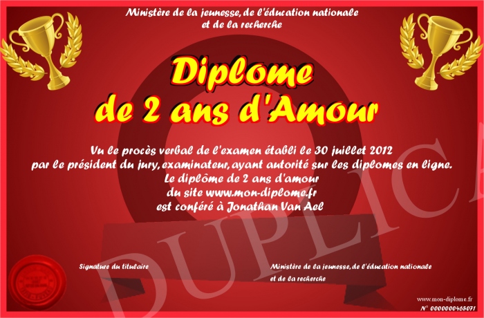 Envoyez par email votre Diplôme de 2 ans d'Amour personalisé