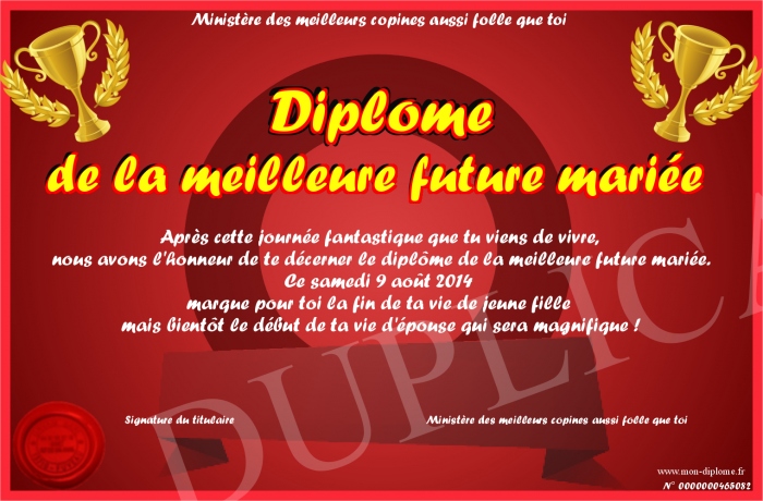 Envoyez par email votre Diplôme de la meilleure future mariée personalisé