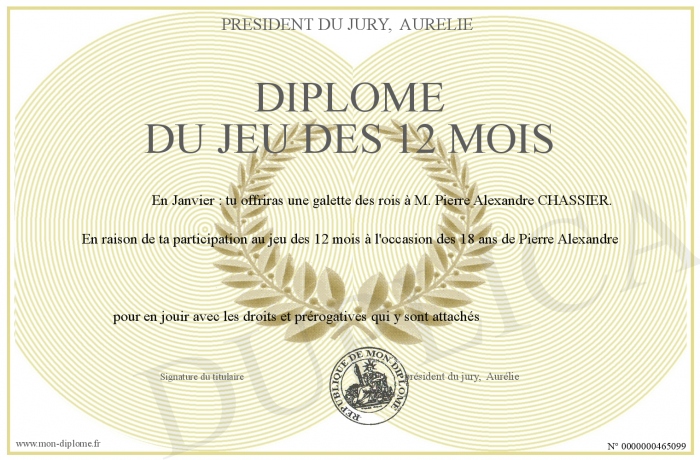 Envoyez par email votre Diplôme du jeu des 12 mois personalisé