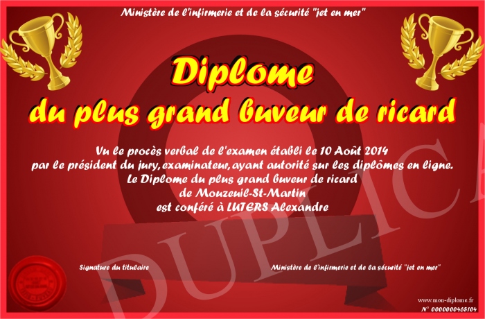 Envoyez par email votre Diplôme du plus grand buveur de ricard personalisé