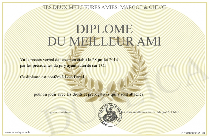 Envoyez par email votre Diplome du meilleur ami personalisé