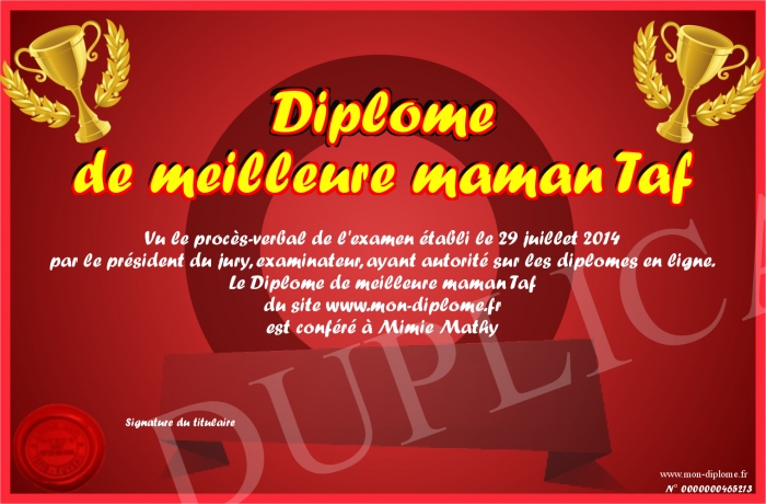 Envoyez par email votre Diplôme de meilleure maman Taf personalisé