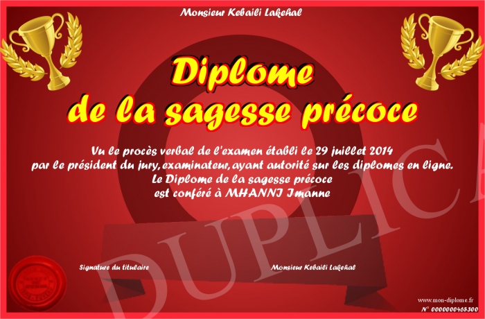 Envoyez par email votre Diplôme de la sagesse précoce personalisé