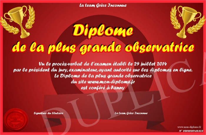 Envoyez par email votre Diplôme de la plus grande observatrice personalisé