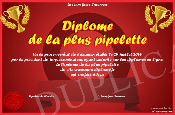 Envoyez par email votre Diplôme de la plus pipelette personalisé