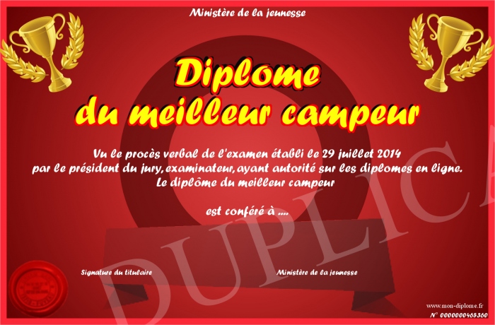 Envoyez par email votre Diplôme du meilleur campeur personalisé