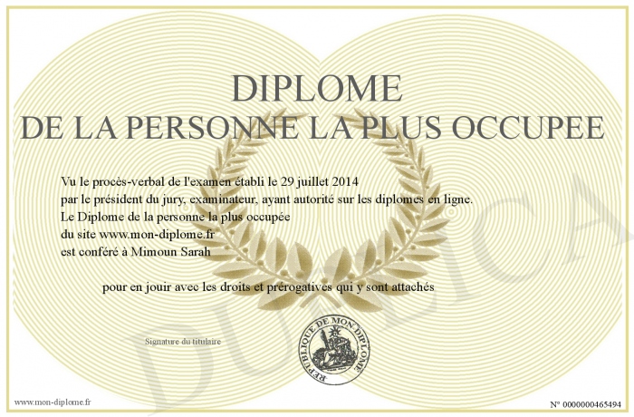Envoyez par email votre Diplome de la personne la plus occupée personalisé