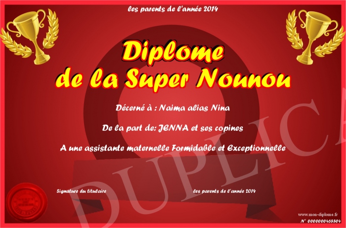 Envoyez par email votre Diplôme de la Super Nounou personalisé