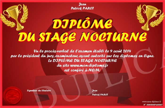 Envoyez par email votre DIPLÔME DU STAGE NOCTURNE personalisé