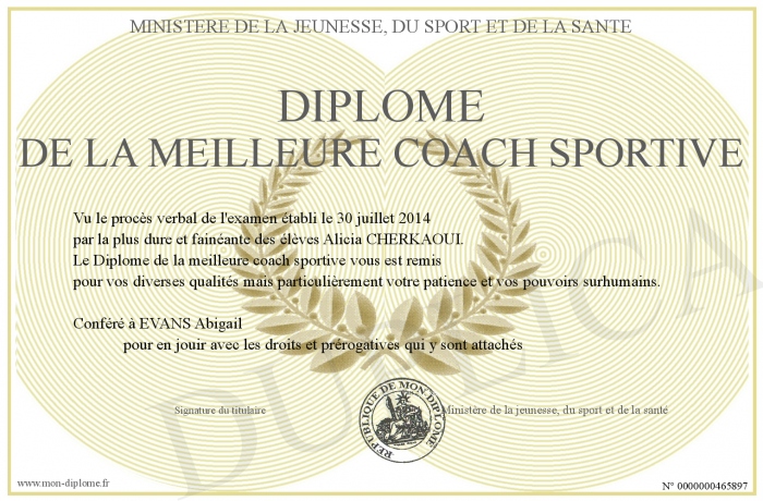 Envoyez par email votre Diplôme de la meilleure coach sportive personalisé