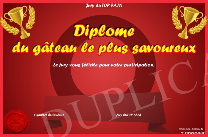 Envoyez par email votre Diplôme du gâteau le plus savoureux personalisé