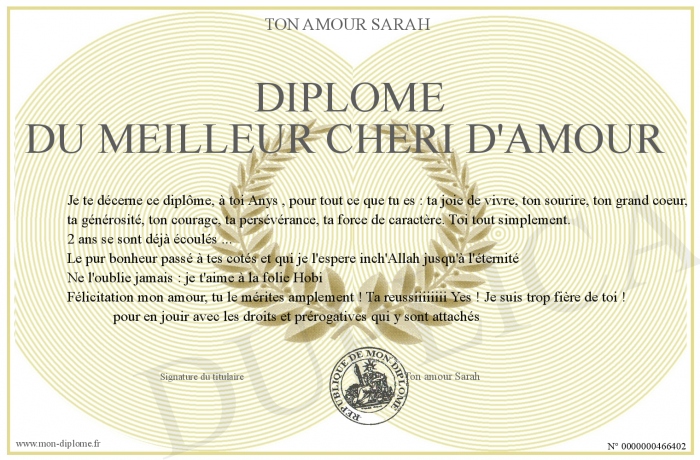 Envoyez par email votre Diplôme du meilleur chéri d'amour personalisé