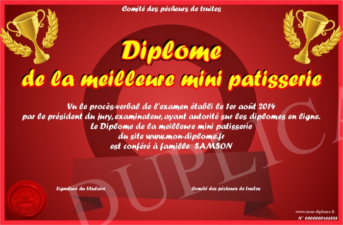 Envoyez par email votre Diplôme de la meilleure mini patisserie personalisé