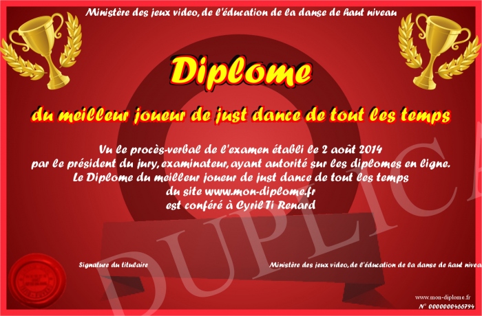 Envoyez par email votre Diplôme du meilleur joueur de just dance de tout les temps personalisé