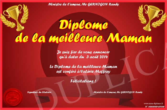 Envoyez par email votre Diplome de la meilleure Maman personalisé