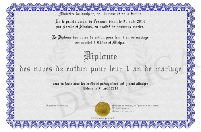 Envoyez par email votre Diplome des noces de cotton pour leur 1 an de mariage personalisé