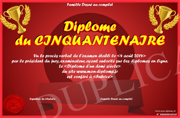 Envoyez par email votre Diplôme du CINQUANTENAIRE personalisé
