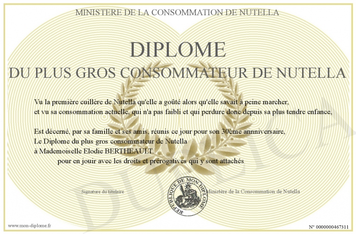 Envoyez par email votre Diplôme du plus gros consommateur de Nutella personalisé
