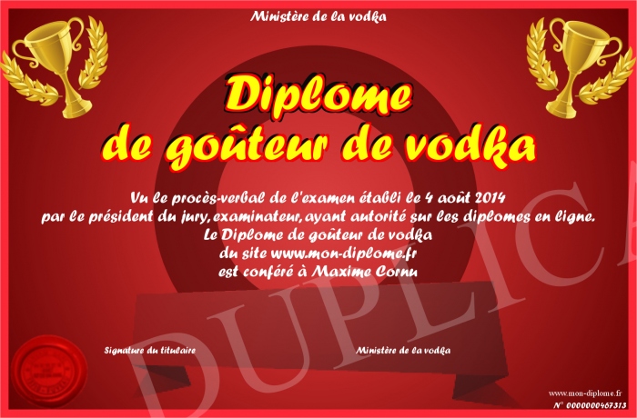 Envoyez par email votre Diplôme de goûteur de vodka personalisé