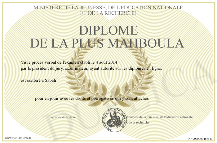 Envoyez par email votre Diplôme de la plus mahboula personalisé