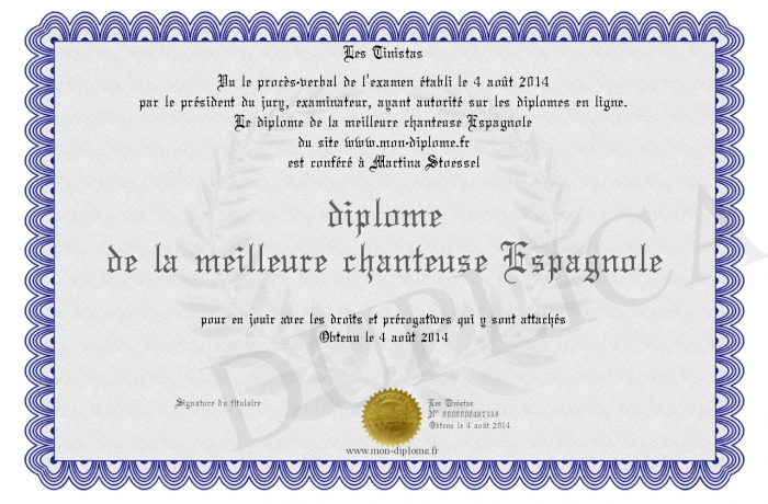Envoyez par email votre diplome de la meilleure chanteuse Espagnole personalisé