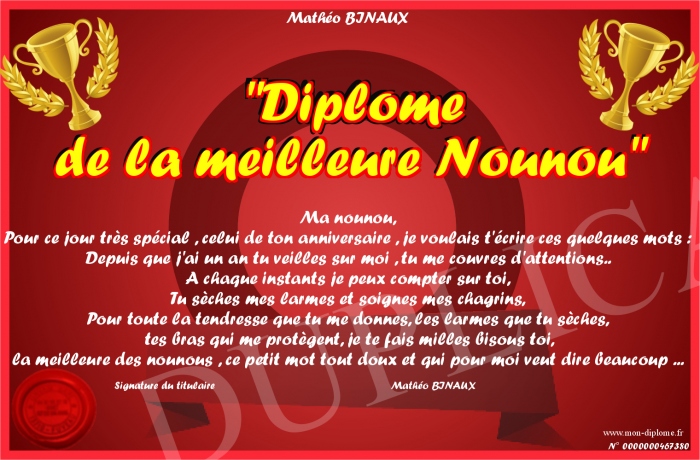 Envoyez par email votre -Diplôme de la meilleure Nounou- personalisé