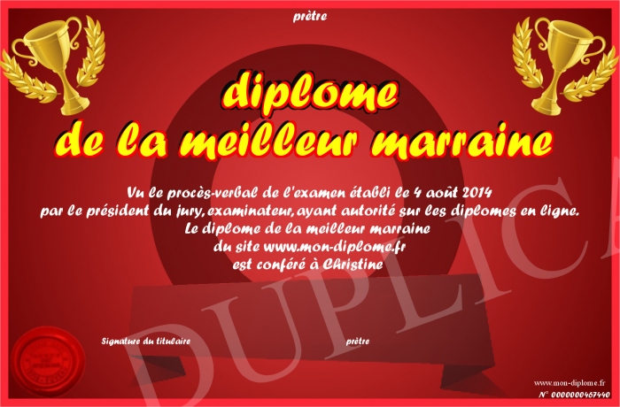 Envoyez par email votre diplome de la meilleur marraine personalisé