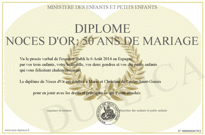 Envoyez par email votre Diplôme NOCES D'OR: 50 ANS DE MARIAGE personalisé