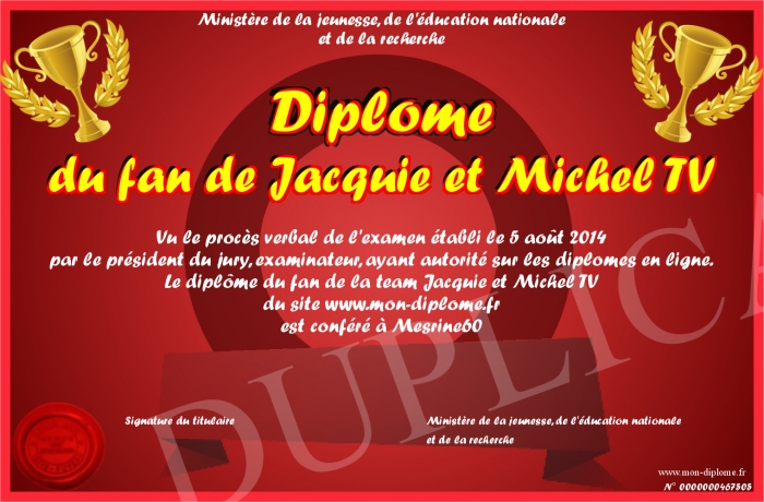 Envoyez par email votre Diplôme du fan de Jacquie et Michel TV personalisé