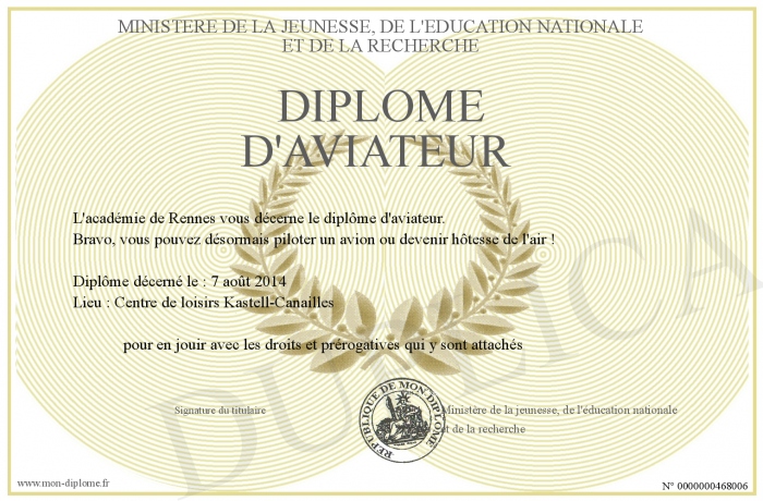 Envoyez par email votre Diplôme d'aviateur personalisé