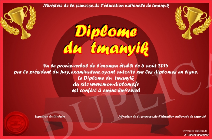 Envoyez par email votre Diplôme du tmanyik personalisé