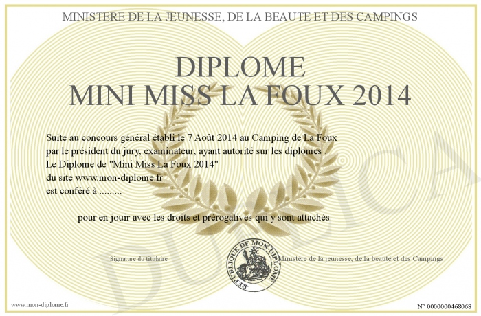 Envoyez par email votre Diplôme Mini Miss La Foux 2014 personalisé