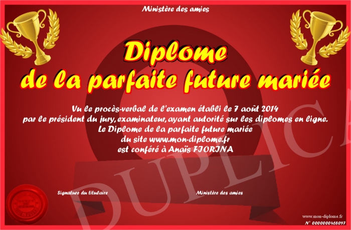 Envoyez par email votre Diplôme de la parfaite future mariée personalisé