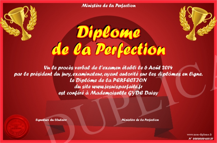 Envoyez par email votre Diplôme de la Perfection personalisé